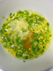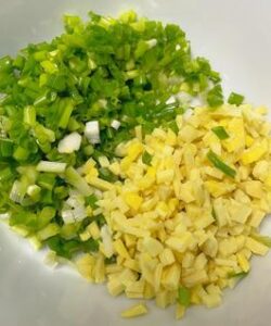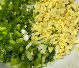 While the chicken thighs are cooking, mince ginger and scallions and set aside in a large bowl. The more ginger and scallions you use, the better—it makes it extra fragrant!