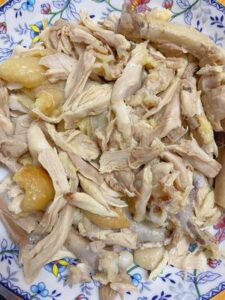 Once the chicken legs are cooked through, let them cool slightly. Put on gloves and shred the meat into a plate.