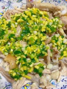 Drizzle the scallion and ginger sauce over the shredded chicken. You don’t need to use all the oil.