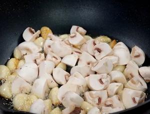 Wash the button mushrooms and cut the chicken breast into bite-sized pieces.