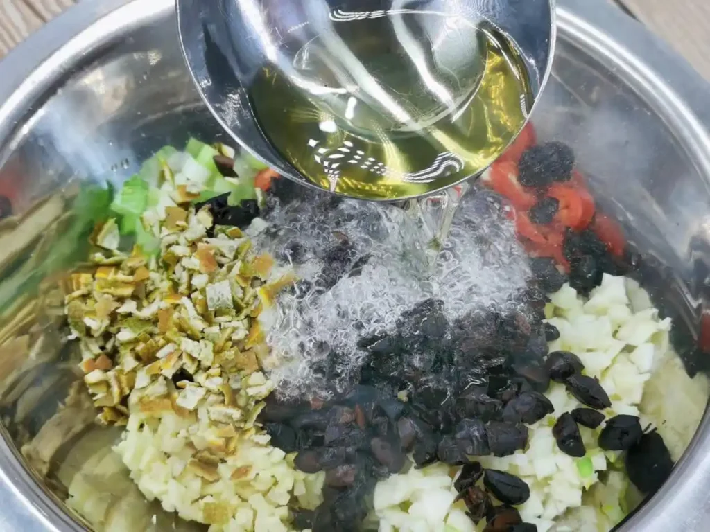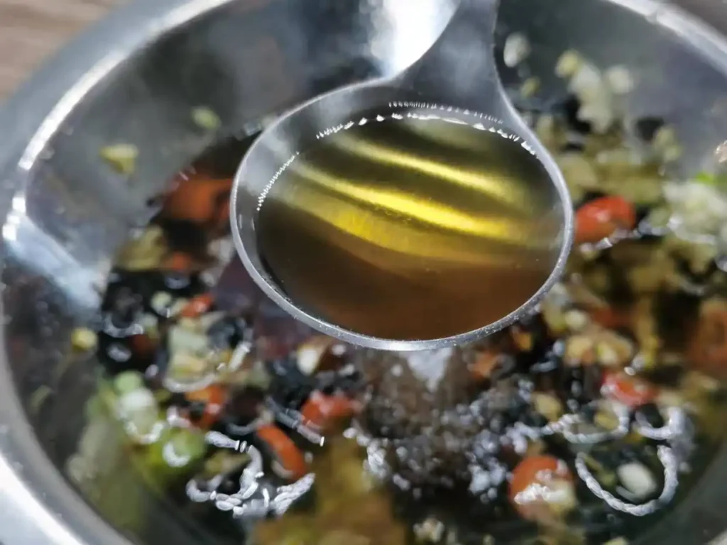 2. Heat the oil to 70% heat and pour it into the dish in two portions. After pouring the first portion, stir with chopsticks, and then pour the remaining hot oil into the dish. This will fully bring out the aroma of all the ingredients. Stir the mixture evenly after pouring the hot oil.
