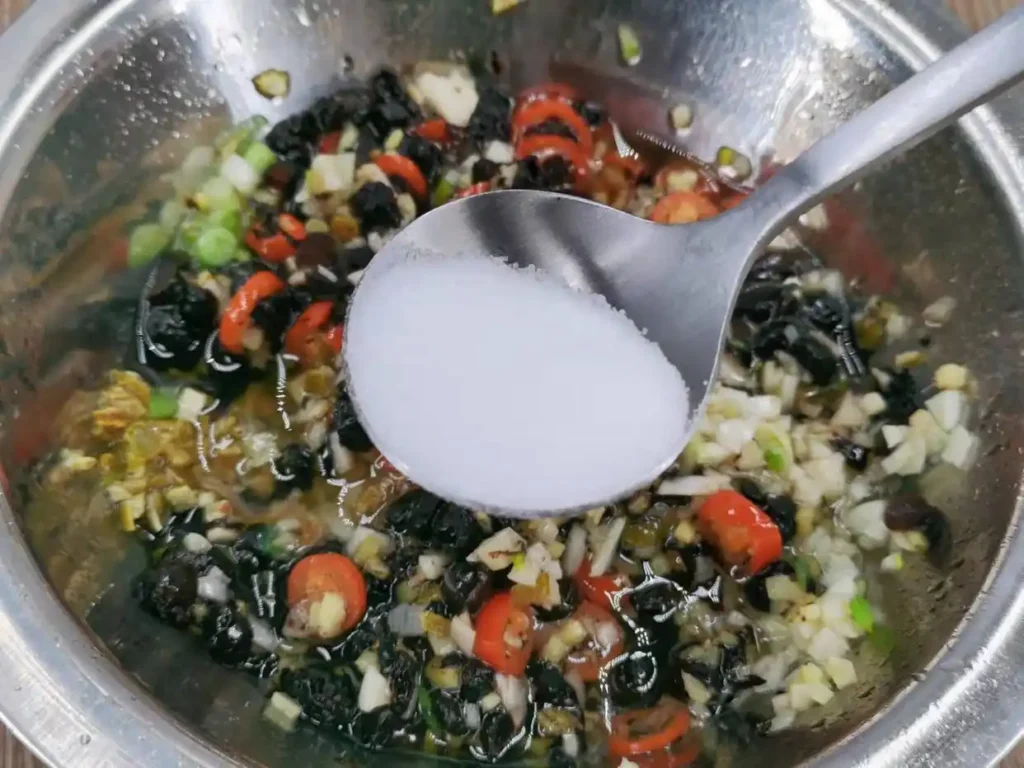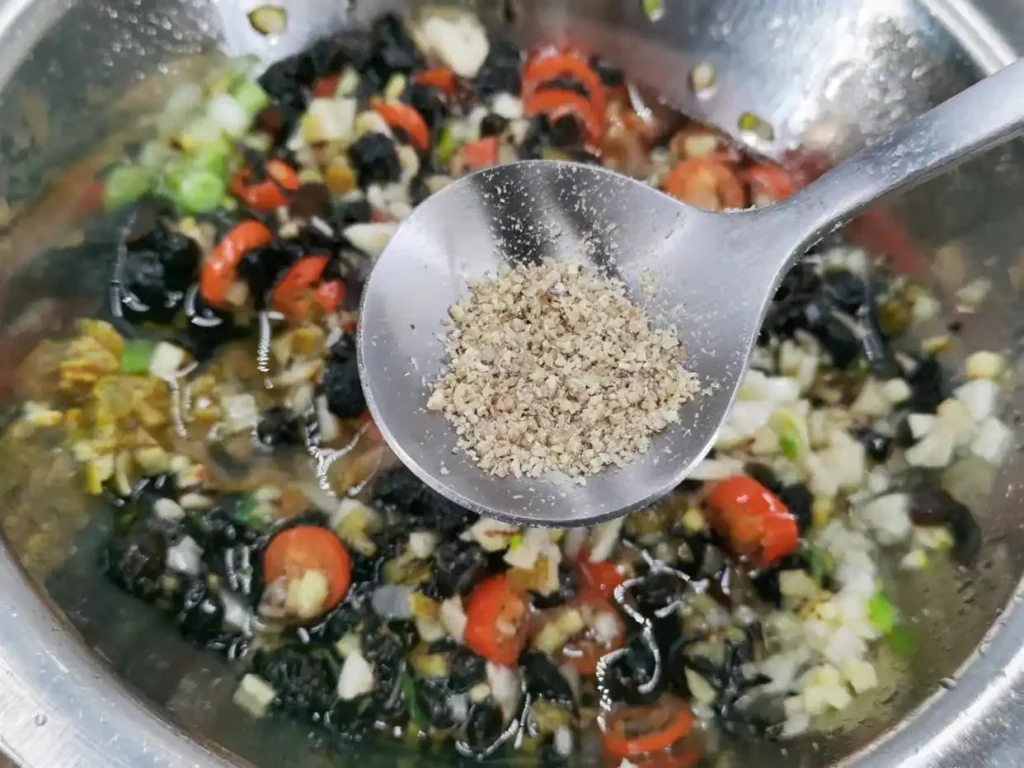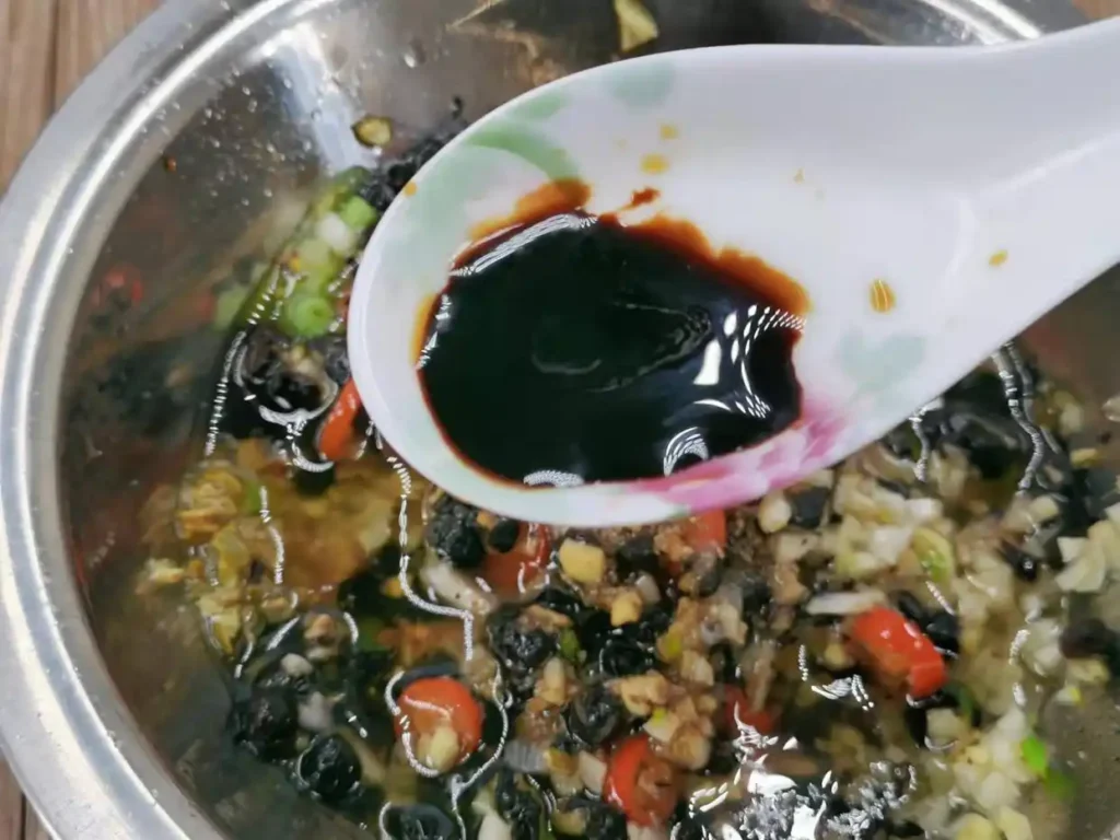 4. First, clean the fermented black bean with clean water. Because the fermented black bean tends to be dirty during the fermentation and drying process, it needs to be cleaned thoroughly to ensure a safe and satisfying taste. However, avoid over-cleaning as it may lead to the loss of flavor, making the effort counterproductive. After washing and draining, chop it slightly with a knife, without deliberately chopping it too finely. Once chopped, place it in a dish and set aside.