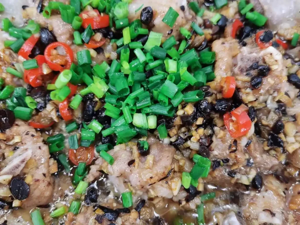17. Remove the steamed pork ribs with black bean sauce. If there is a lot of water in the dish, drain some of it. Then sprinkle chopped green onions on top of the ribs as garnish.