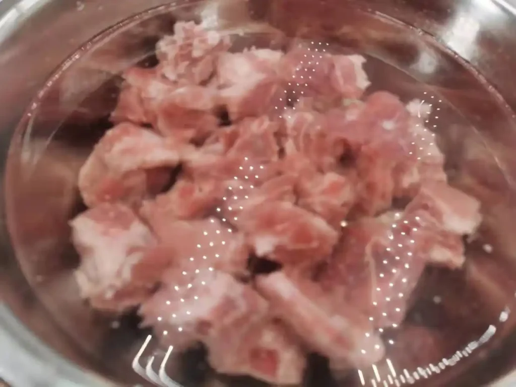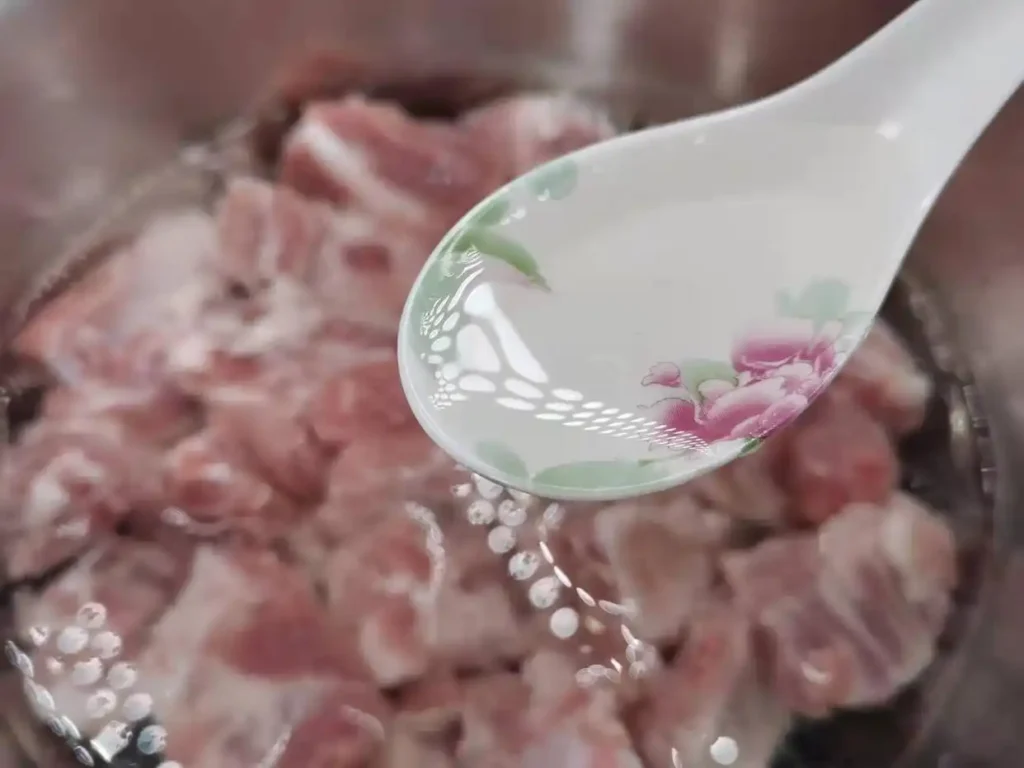 2. After soaking, rinse the ribs with clean water several times. Add just enough water to cover the ribs in a dish, then add 1 tablespoon of white vinegar and mix well. Soak for another 10 minutes. The ribs soaked in white vinegar will turn out tender and soft when steamed.