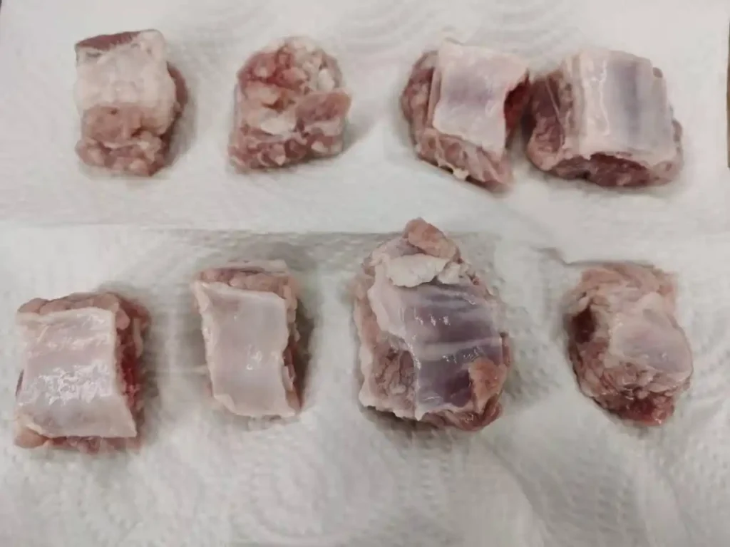 3. Rinse the vinegar-soaked ribs with clean water to remove the vinegar taste. After rinsing, squeeze out the water in the ribs with your hands, and then use a clean towel or kitchen paper to absorb the water on the surface of the ribs. If there is too much water in the ribs, it will be difficult for the seasoning to penetrate, and the steamed ribs will taste bland and will release a lot of juice, which will make them look unappealing and taste bad. Place the water-controlled ribs in a large dish for later use.