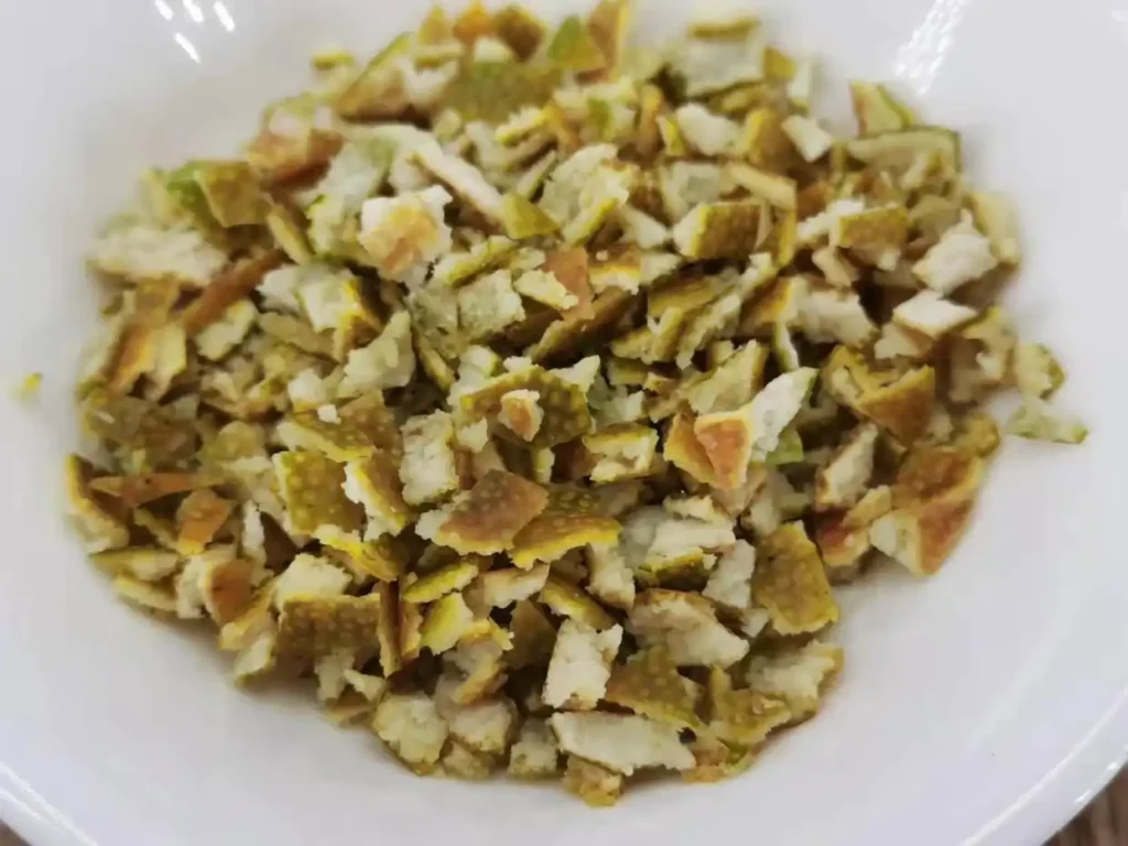 5. Among all the ingredients for this steamed pork ribs with black bean sauce, fermented black beans and dried tangerine peel are indispensable. If you really can’t find dried tangerine peel, you can use a piece of orange peel to cheat yourself. First, soak the dried tangerine peel in water until it becomes soft. Then, use a knife to remove the white pith inside the dried tangerine peel, as this part is bitter and must be removed, otherwise it will affect the taste. After soaking, cut the dried tangerine peel into strips and then into small pieces for later use.