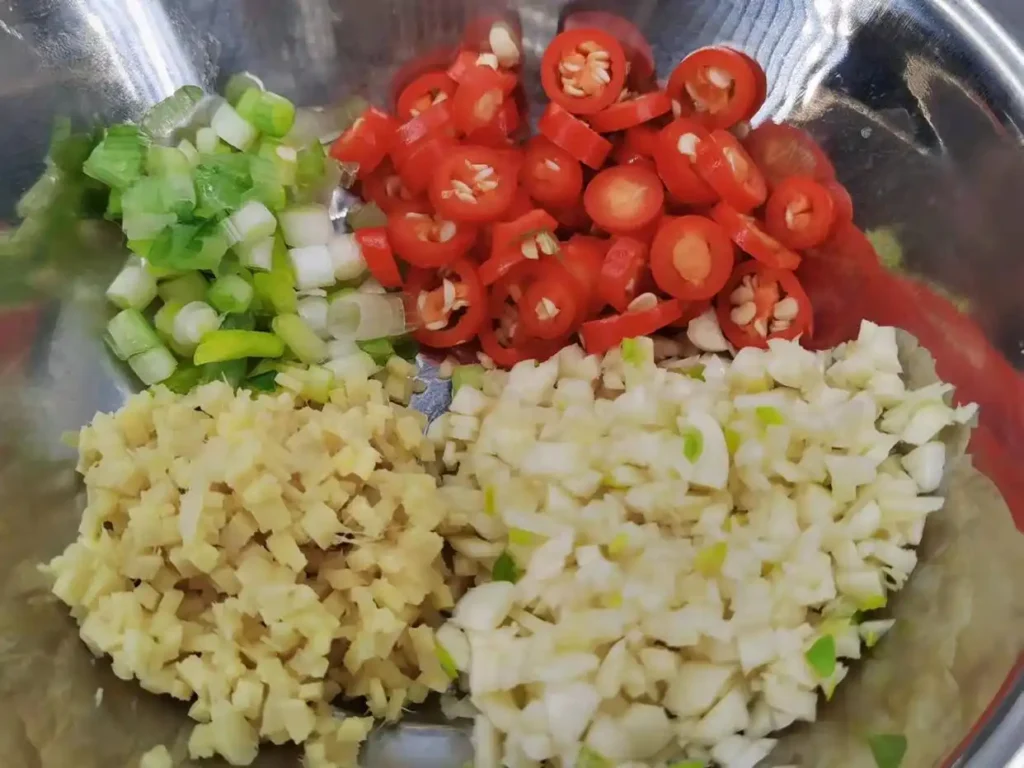 6. Peel and clean the ginger. First, slice it thinly, then shred it into thin strips, and finally chop it into ginger powder. Chop the garlic into garlic powder, the white part of the green onion into chopped green onion, and the chili pepper into small rings for later use. If you don’t like spicy food, you can omit the chili pepper.