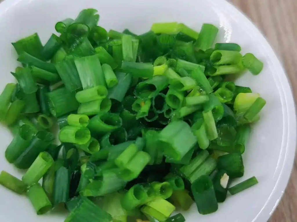 7. Cut the green part of the green onions into small pieces for use as garnish. The green part is used to decorate the noodles, so set it aside separately for later use.
