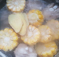 Add enough fresh water to the pot again, put in the ribs and bring to a boil. Add the ginger slices and sweet corn pieces, bring the mixture to a rolling boil over high heat, then turn the heat down to low.