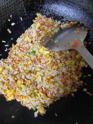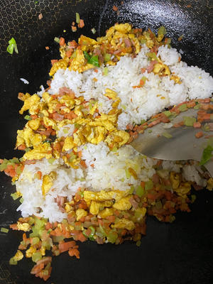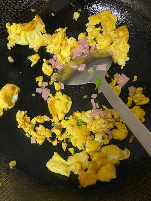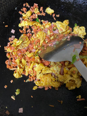 Once the eggs are scrambled, add the diced bacon and continue to stir-fry.